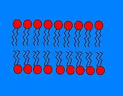 The cellular bilayer is not a rigid and clearly defined structure separating the intracellular and extracellular environments. Realistically, there is significant fluid motion of individual lipid headgroups and their aliphatic chains within the plane of the bilayer. This is due to the low torsional angle barriers within the structures of the lipids and to the steric hindrances that result from the cis-double bounds of some aliphatic chains.[1]