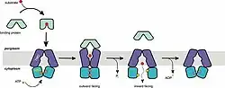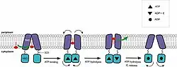 The general mechanism for the transport cycle of ABC transporters has not fully been clarified but substantial structural and biochemical data has been gathered to support a model in which ATP binding and hydrolysis is coupled to conformation changes in the transporter. The resting state of all ABC transporters has the NBDs in an open dimer configuration with a low affinity for ATP but a high affinity for substrate binding site. This open conformation contains a chamber that is accessible to the interior of the transporter. The transport cycle is initiated by the binding of the substrate to the high-affinity site on the TMDs, which induces the conformational changes in the NBDs and enhances the binding of ATP. Then, two molecules of ATP bind cooperatively to form the closed dimer configuration. The closed NBD dimer then induces a conformational change in the TMDs such that the TMD opens, which forms a chamber with an opening that is opposite that of the initial state. The affinity of the substrate to the TMD is then reduced, which releases the substrate. Following that is the hydrolysis of ATP and the sequential release of inorganic phosphate and ADP. The ADP restores the transporter to its basal configuration. Although this common mechanism has been suggested, the order of substrate binding, nucleotide binding and hydrolysis, and conformational changes as well as the interactions between the domains, is still being debated.