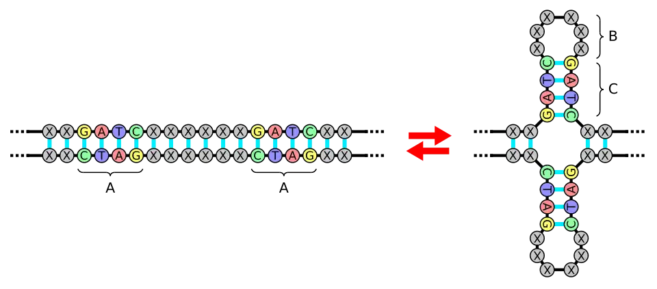 Palindromic sequences have been tied to different genomic rearrangements in different organisms depending on the length of the repeated sequences. Shorter palindromic sequences (shorter than 30 bp) are very stable while longer sequences are not stable in vivo. These sequences occur in both eukaryotes and prokaryotes. These sequences also increase inter and intrachromosomal recombination between homologous sequences. Hairpin structures can form from palindromic sequences due to base pairing in single-stranded DNA. These structures can be substrates for structure-specific nucleases and repair enzymes which can lead to a double-strand break in the DNA. This then leads to loss of genomic material which can cause meiotic recombination. Studies with a 140-bp long mutated palindromic sequence inserted in yeast have shown to lower postmeiotic segregation and increase rate of gene conversions, while shorter sequences do the opposite. Research also found that during meiosis, double-strand breaks are induced by the long 140-bp palindromic sequence. In the long hairpin structure, the entire stem-loop is not covered and the processing endonuclease is exposed, which makes nicks in the loop. This nick creates a gap which is repaired by the wild-type strand. The induction of double-strand breaks during meiosis is what causes genomic instability.