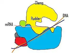 RNA polymerase have a multitude of structural features that help in the transcription process. A Structure known as the clamp keeps the polymerase anchored to DNA . The flap ensures that the MRNA is retained. The rudder prevents DNA/RNA hybrid from occurring. DNA does not enter the mouth of the polymerase directly. It is usually held sidewise with a sharp bend to its left as it exits the polymerase. mRNA is believed to leave from the back of the polymerase. NTPs enter the active site as the same channel that DNA is pulled through but through a secondary channel .