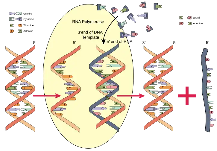 RNA polymerase is an enzyme that produces RNA and catalyzes the initiation and elongation of RNA chains from a DNA template. RNA is created using a process known as transcription. The RNA polymerase is a key component to this process. The reaction that this enzyme catalyzes for is: (RNA)n + Ribonucleoside Triphosphate ->/<- (RNA)n+1 +PPi. RNA polymerases are relatively large. The size of RNA polymerase in a typical eukaryotic cell is roughly 500kDa. In bacteria it is roughly 400kDa and in T7 bacteriophage it is roughly 100kDa. Their speed of transcription is about 50 bases per second. A typical mRNA that codes for an average protein takes about 20 seconds in a prokaryotic cell and about 3 minutes in a eukaryotic cell. It is primarily longer in eukaryotes due to the fact that eukaryotic genes contain many segments that contain introns.