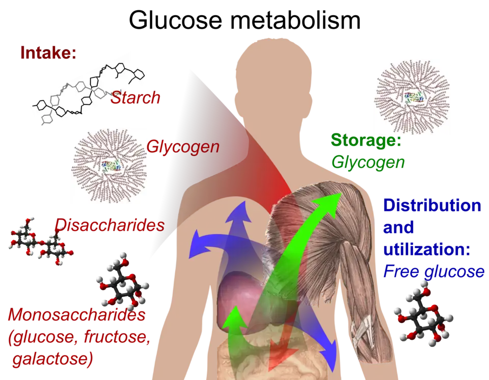 Glucogen Metabolism Glucose metabolism and various forms of it in the process is described by the process below. Glucose-containing compounds are digested and taken up by the body in the intestines, including starch, glycogen, disaccharides and as monosaccharide. Glucose is stored in mainly the liver and muscles as glycogen. It is distributed and utilized in tissues as free glucose.