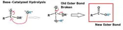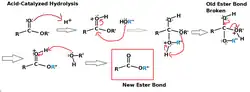 Step 4: Hydrolysis: The electrons from the hydroxl group moves down forming a double bond, thus kicking out the old ester group.