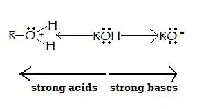 Alcohols are amphoteric species that may exist as both acids and bases. At low pH, or when surrounded by strong acids, they may be protonated to alkyloxonium ions. In contrast, at high pH and when surrounded by strong bases, they may exist as alkoxide ions.