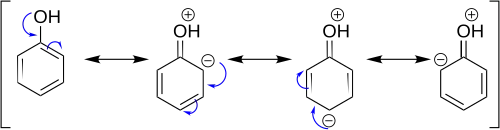 Phenols are hydroxy-arenes. They have some similarities to alcohols in chemical reactivity at oxygen, but they are much more acidic and much less basic. They appear to be enols (hydroxy attached to an alkene) and should be unstable relative to the keto form, but the gain in aromaticity in being in the enol favors the enol form relative to the keto. Examination of the resonance forms indicates that the hydroxyl donates electron density to the ring, hence the hydroxyl group is activating and ortho-para directing.