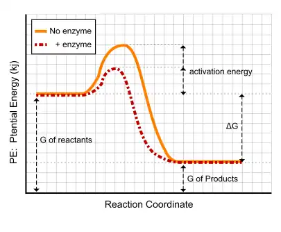 This graph shows how the presence of an enzyme lowers the activation energy and therefore speeds up the reaction. Reactions with enzymes can speed up to 10 billion times faster than those without an enzyme. The rate at which the enzyme works is affected by the substrate and enzyme concentration, temperature, and pH.