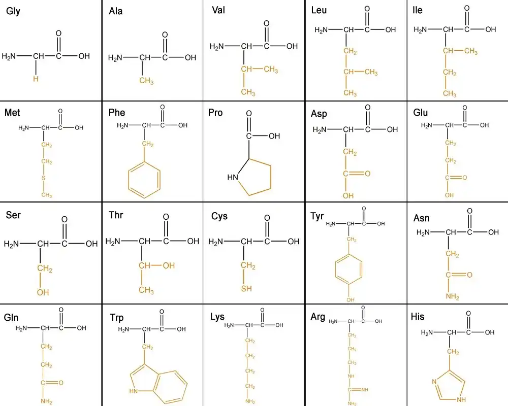This table shows all the amino acids and the their side chains. From left to right they are: glycine(Gly), alanine(Ala), valine(Val), Leucine(Leu), isoleucine(ILe), methionine(Met), phenylalanine(Phe), proline(Pro), aspartic acid(Asp), glutamic acid(Glu),serine(Ser), threonine(Thr), cystine(Cys), tyrosine(Tyr), asparagine(Asn), glutamine(Gln), tryptophan(Trp), lysine(Lys), arginine(Arg), and histidine (His).