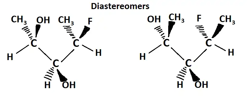 Diastereomers are any stereoisomers that are not enantiomers. Thus, diastereomers are not mirror images of each other. Because diastereomers are stereoisomers that aren't mirror images of each other, they can be distinguished by different physical and chemical properties. Thus, it is possible to separate diastereomers by standard laboratory techniques. Diastereomers arise when stereoisomers of a molecule have different configurations at at least one of their stereocenters (but not all, for they would then be enantiomers). Each stereocenter possesses two configurations, so the number of stereoiosmers is increased by a factor of two. Cis/trans isomerism is a form of diastereomerism (cis-two substituents pointing in the same direction; trans-two substituents pointing in opposite directions).