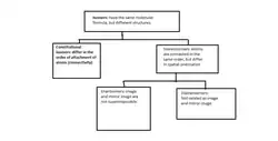 Molecules that are isomers have the same molecular formulas but their structures are different from each other. There are two main categories of isomers: constitutional isomers and stereoisomers. Constitutional isomers, also known as structural isomers, are molecules that have the same molecular formulas but their connectivity is different. Oftentimes constitutional isomers have very different physical and chemical properties. Stereoisomers can be divided into two sub-categories: enantiomers and diastereomers. Enantiomers are molecules that are mirror images of one another and are not super-imposable. These molecules have the same connectivity but differ in their 3D arrangement of carbon substituents. Oftentimes enantiomers have very similar physical properties but they may differ in chemical properties. Diastereomers are molecules that are not related as mirror images but, like enantiomers, have the same connectivity but differ in their 3D arrangement of carbon substituents.