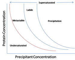 Though phase diagrams are generally viewed as a map that shows the state of a substance at certain conditions, this simple tool can be used to analyze other complicated materials. An example is that the information derived from a phase diagram can be used for the discussion of protein crystallography. This diagram is a representation of what protein and precipitant concentrations are needed for protein crystallography. The red line is called the solubility line and it distinctly separates undersaturated conditions from the supersaturated, which is the condition desired for protein crystallization. The supersaturated part of the diagram consists of three parts: metastable, labile, and precipitation.