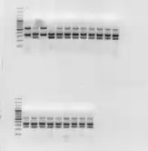 This is an example of a gel run using PCR reaction products. The columns on the far left are 100bp ladders which track the movement of segments of 100, 200, 300, etc. base pairs. Each of the wells represents the DNA taken from a mouse. As seen in the picture, some mice lack one of the DNA sequences that would be amplified by use of the primers. Here it is seen how strong of a tool PCR can be in identifying the targeted sequences of DNA in respect to mice which carry those genes. Since mice of different genetic backgrounds can be distinguished, further conclusions about certain genes can be made.