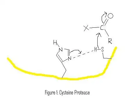 An example of a Cysteine Protease is papain, which is found in the papaya fruit. The catalytic mechanism that this enzyme uses to hydrolyze a peptide bond involves the activation of a cysteine residue by a histidine residue, both present in the active site. The result of this activation is a powerful nucleophile that is able to attack the carbon present in the carbonyl group present next to the peptide bond.