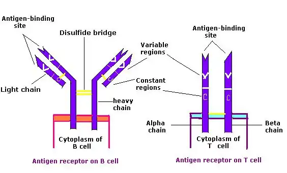 Antigen is a macromolecule that causes an immune response by lymphocytes. Antigen receptor, a surface protein located on B cells and T cells, binds to antigens and initiates acquired immune responses. The antigen receptors on B cells are called B cell receptors (or membrane immunoglobulins) and the antigen receptors on T cells are called T cell receptors.