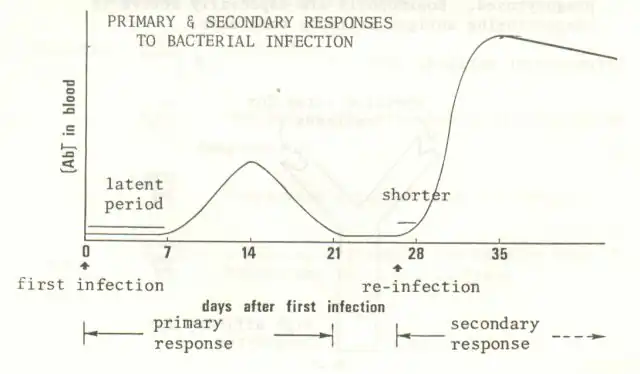 In wake of first (primary response) infection involving a particular antigen, the responding naive cells proliferate to produce a colony of cells, most of which transform into plasma cells or effector B cells (which produce the antibodies) to resolve the infection, and the rest persist as the memory cells that can survive for years, or indeed even for a lifetime. This is a complicated set of reactions that needs a latent period for the production of antibodies.