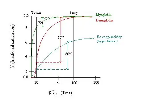 The biological of this sigmoid model of oxygen binding leads to efficient oxygen transport. The unloading of oxygen can be seen in the graph where in the lungs (100 torr) the protein is saturated with oxygen and all of the oxygen binding sites are occupied. However when this is moved to the tissues to release the oxygen, the saturation level drops and the total unloading oxygen level is 66%. This situation is favored because the hemoglobin goes through cooperativeness and it increases the tendency for oxygen binding and unbinding. Unlike myoglobin, which binds to tightly to oxygen for its release.