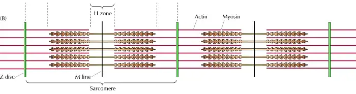 Skeletal muscles are responsible for voluntary movement. Skeletal muscles contain many muscle fibers and these muscle fibers are actually made up of myofibrils, bundles of thick myosin filaments and thin actin filaments. Myofibrils are constructed and lined up in a chain-like formation to create what are called sarcomeres. Sarcomeres contain several regions. One region is called the A-bands and only consist of myosin filaments. The counterpart of A-bands is the I-bands that only contain actin filaments. The ends of each sarcomere are called Z discs. A middle region of each sarcomere called the H-zone only contains myosin.