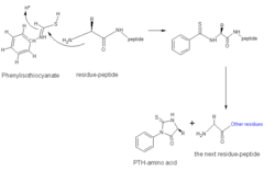 1. This method is done by cleaving the amino acid one by one from the amino terminal. The chemical used for this process is Phenyl isothiocyanate. Amino acids that react with this chemical will form phenylthiohydantoin (PTH)-amino acid (e.g. PTH-glycine). Under mildly acidic conditions,( PHT)-one termial residue is released. This compound is then identified using chromatographic procedures. Edman degradation is quite simple to perform (the sequencer is automated), but this method is not effective for long peptides (more than 50 residues) because it takes an hour to perform one cycle of degradation.
