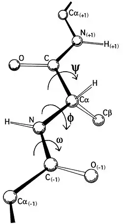 Torsion angles are among the most important local structural parameters that control protein folding - essentially, if we would have a way to predict the Ramachandran angles for a particular protein, we would be able to predict its 3D structure. The reason is that these angles provide the flexibility required for folding of the polypeptide backbone, since the third possible torsion angle within the protein backbone (called omega, ω) is essentially flat and fixed to 180 degrees. This is due to the partial double-bond character of the peptide bond, which restricts rotation around the C-N bond, placing two successive alpha-carbons and C, O, N and H between them in one plane. Thus, rotation of the main chain (backbone) of a protein can be described as the rotation of the peptide bond planes relative to each other.