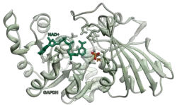 GAPDH is also involved in the GAIT complex, which is a γ-interferon-activated inhibitor of translation.[1] In this complex, the GAPDH controls mRNA translation under the direction of the γ-interferon.