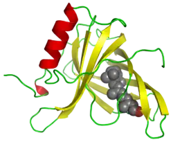 IRBP is a soluble lipoglycoprotein made by photoreceptor neurons. Its major function is thought to be facilitating the transport of retinoids between the cell layers of photoreceptors and RPE. In contrast to the single domain observed in RBP and CRBP, the protein contains approximately three to four retinoid binding sites. The protein adopts a rod-shape structure and upon ligand binding, conformational changes to a bent molecular structure. Upon further structural analysis, two hydrophobic cavities are revealed to be potential ligand binding sites.