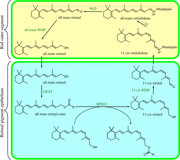 The first step of the recycling process is carried out by retinol dehydrogenases (RDHs), where all the trans-retinal is reduced to trans-retinol. The main RDHs are the RDH8 in outer segments (OS) photoreceptor and RDH12 in photoreceptor inner segments (there are other RDHs). All the trans-retinol is transported from the OS to the RPE, where they are esterified. This process is facilitated by two retinoid-binding proteins called the interphotoreceptor retinoid-binding protein (IRBP) and cellular retinol-binding protein-1 (CRBP1). These trans-retinyl esters form a stable storage form for vitamin A and oil droplet structures called retinosomes. Then, the enzyme RPE65 catalyzes the endothermic reaction that converts all trans-retinoids to 11-cis-retinols. In the final step, enzymes such as RDH5, RDH10, and RDH11 catalytically oxidize the 11-cis-retinols to the original 11-cis-retinals that are needed to sustain vision. These 11-cis-retinals then bind to cellular retinaldehyde-binding protein (CRALBP), which mediates its transport back to the photoreceptor OS and opsin.