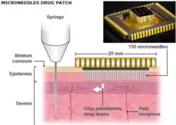 Transdermal patch utilizes diffusion through the skin to sustain drug released. Examples are transdermal patch. Picture below demonstrates the difference between traditional intramuscular injection and a transdermal patch. As can be seen from the illustration, intramuscular injection can be much more painful than transdermal patch.