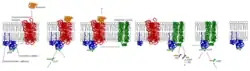 Heterotrimeric G-proteins contain three subunits: α, β, and γ. These three subunits are normally inactive when binded together. When a signalling molecule binds to the receptor, phosphorylation occurs and the GDP turns into GTP, which then allows the α subunit to dissociate, thus activating the G-protein. The α subunit then binds to an effector protein and allows for difference responses and mechanisms throughout the cell.