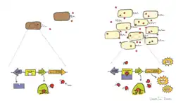 Quorum sensing is the chemistry involved in the bioluminescent bacterium's. It is the communication between cells that organize the expression of genes from the changes in the population density of the bacteria. In other words, it could be how the bacteria "speak" to each other through chemical signals to eventually light up in the waters. It is very dependent on the cell densities (high cell density vs. low cell density), and glows under certain conditions. When in low density (i.e. in the open marine sea) it, the luminescent genes are off. But if in high density (i.e. in symbiosis with the Hawaiian squid) the luminescent genes are on. Quorum sensing was first observed with the Vibrio fischeri. The chemistry when in relation with the Hawaiian Bobtail Squid will be explained:
