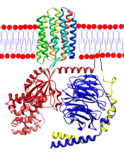 Transducin;alpha subunit is red, beta is blue, and gamma is yellow