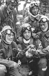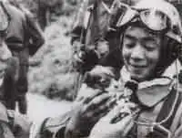 Photo to the right shows Corporal Yukio Araki holding a puppy with four other young men of the 72nd Shinbu Corps around him. An Asahi Shimbun cameraman took this photo on the day before the departure of the 72nd Shinbu Corps from Bansei Air Base. Yukio Araki died at the age of 17 in a suicide attack on American ships near Okinawa on May 27, 1945.