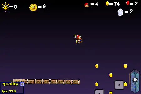Jump on the wobbly platform, and then you'll see cubes moving back and forth and Coins over a wobbly platform. Hover past this, and you'll be at a brick platform. Over you will be golden cubes moving up and down. Jump and hover through these, and upwards is the Shine Sprite. Grab it to finish this course.