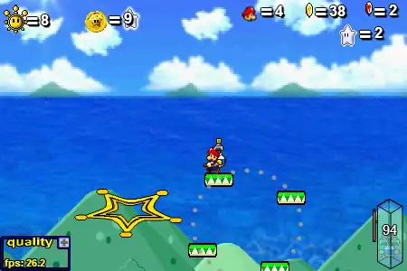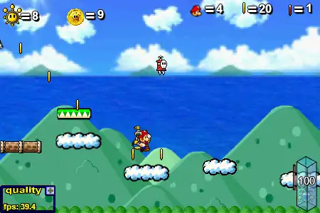Jump past the little clouds, looking out for Parakoopa's along the way. You then should come to a platform moving back and forth, leading upwards. Ride it up to a Red Coin, and then jump past the wobbly platform. You should come to a Rocket F.L.U.D.D box and a lift. Jump on the lift, or use the Rocket to propel yourself to the next area. Assuming you took the lift, jump through the moving and bobbing platforms up to a cliff. Grab one of the first Star Powers in the game, the Wing Cap, and jump into the cannon.