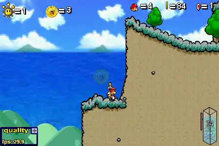 Head right when you'll find a crate in the ground, guarding a Turbo F.L.U.D.D. Jump over the cliff, and head right past the cannon in the tall rock and move onto the next section. As soon as you come into this section, you'll have a boulder rolling right at you, so watch out! Jump over or hover, either way, you should dodge. Keep heading right to a small rock and hop on it. Jump onto the hill to you left in the background from that rock. Start going left, and you'll find two signs reminding you that you can change the camera zoom and one warning of falling objects.