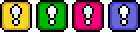 ?-blocks always contain items. It can be one or more coins, but also a P-cloud, a cape feather, a Fire Flower, a Super Mushroom, a 1-up, or a Yoshi egg. To get as much coins out of a ?-block, stand under it and start jumping very fast. When the block has no more items in it, it will turn into a solid block. You can't break ?-blocks by spin-jumping on them. They sometimes appear if you press a P-switch, creating new paths for you. At the start of some courses is a Starman, if you grab it and then run you'll sometimes find another ?-block. Jumping against it while you're still invincible will sometimes pop a new Starman out of it. Grab it and run further, until you see another ?-block, repeating the trick, and so on. ?-blocks first appeared in Super Mario Bros.