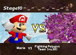 Fighting Polygons (or "the Fighting Polygon Team") are metallic-looking purple clones of playable characters (There are no Polygons for Master Hand, Metal Mario, Giant Donkey Kong, and, obviously The Fighting Polygon Team) made completely out of polygons in Super Smash Bros.. The next to last level in the game contains 30 of these relatively weak clones of existing SSB characters.