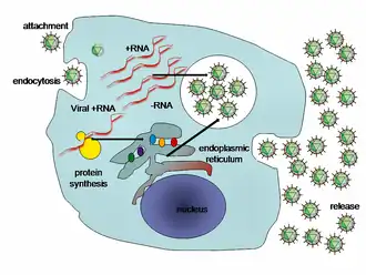 When a virus infects a cell, the virus forces it to make thousands more viruses. It does this by making the cell copy the virus's DNA or RNA, making viral proteins, which all assemble to form new virus particles.[27]