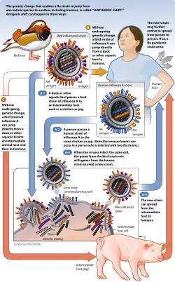 Pigs are unusual as they can be infected with influenza strains that usually infect three different species: pigs, birds and humans.[65] This makes pigs a host where influenza viruses might exchange genes, producing new and dangerous strains.[65] Avian influenza virus H3N2 is endemic in pigs in China, and has been detected in pigs in Vietnam, increasing fears of the emergence of new variant strains.[66] H3N2 evolved from H2N2 by antigenic shift.[67] In August 2004, researchers in China found H5N1 in pigs.[68]