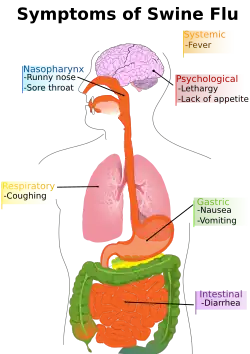 According to the Centers for Disease Control and Prevention (CDC), in humans the symptoms of the 2009 "swine flu" H1N1 virus are similar to those of influenza and of influenza-like illness in general. Symptoms include fever, cough, sore throat, body aches, headache, chills and fatigue. The 2009 outbreak has shown an increased percentage of patients reporting diarrhea and vomiting.[74] The 2009 H1N1 virus is not zoonotic swine flu, as it is not transmitted from pigs to humans, but from person to person.