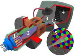 "Yoke": Last, but not least, and NOT a connected part of the Electron Gun, but necessary for the Gun to be properly operated, is a series of coils,(although constructed as one piece). It is positioned on, and around the outside of the neck of the CRT. When the CRT is inserted neck-first into the yoke, the yoke is positioned snug up against the bulb, where the neck of the CRT, joins the bulb proper. In normal operating conditions, when different voltages are applied, according to instructions from the signals received, such causes the Electron Stream to be directed, left-to-right,(horizontally), and up-and-down (vertically). Note: in some TV sets, an external focus coil, [magnetically-focused], is also attached to the Yoke.