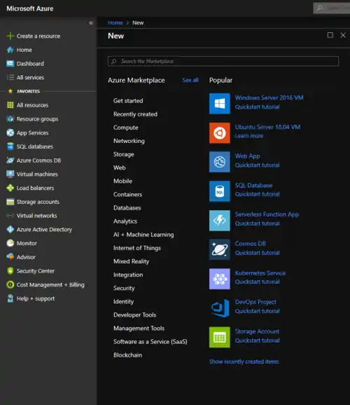 On the main Azure portal, click Create a resource. This will bring you to a menu where popular configurations can be quickly selected. For the purposes of this guide, we'll go with the Windows option.