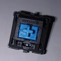 These switches are individual points of contact under each key. There are a variety of different mechanical switches, of which Cherry MX Black, Cherry MX Brown, and Cherry MX Blue are a few examples. The varying switches all have different attributes, examples being tactile response, audible response, force required to activate, and activation point.