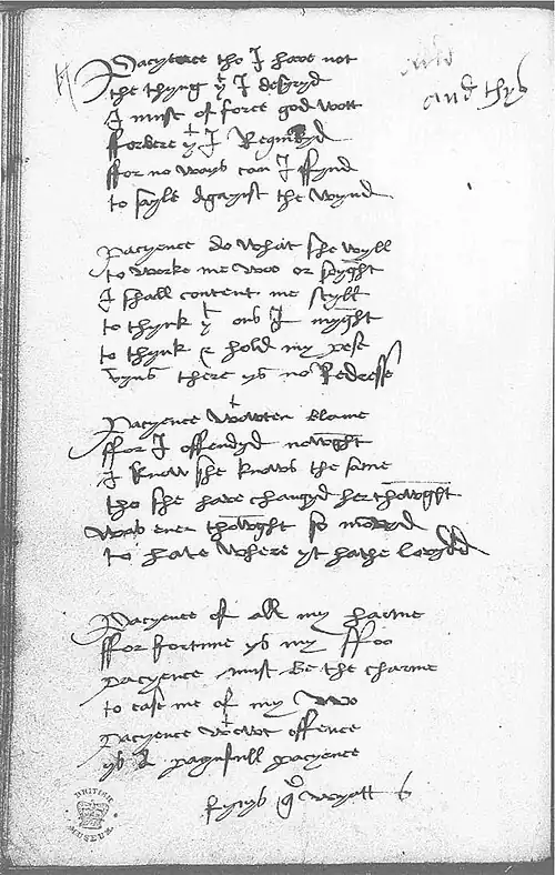 Attributed to Sir Thomas Wyatt,[1] this poem was entered by H2. This poem is an invocation to patience; according to the speaker, the lady hates him for no reason, yet he bears her unwarranted aversion patiently. The related poem, "Patiens for my devise" (71r) is about the Lady’s lament about the patience required by unfaithful men. The two poems taken together seem to be a humorous comment on the general trope of woman’s fickleness found throughout the manuscript.