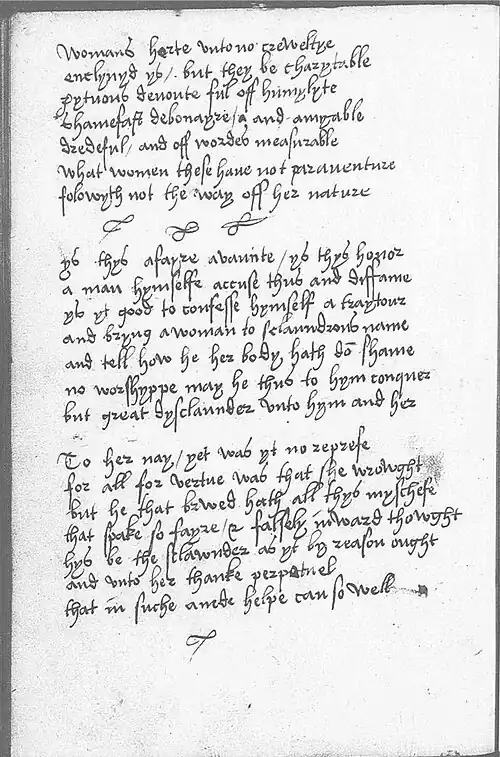This excerpt, entered by TH2, comes from Thomas Hoccleve’s The Letter of Cupid (1402). Hoccleve adapted his work from Christine de Pizan's Epistre au Dieu d’Amours. Two other excerpts from this Hoccleve text are found in this manuscript: “Ys thys afayre avaunte / ys thys honor” (89v), which appears below this excerpt, and “How frendly was medea to Iason” (91r). TH2 transcribed all three excerpts, which he may have copied from Thynne’s edition of Chaucer (c. 1532). This particular selection praises woman’s nature as charitable, compassionate, devout, and humble. TH2 distinguished this excerpt from other verses on the page with distinct flourishes. TH2's transcription of Chaucer’s The Remedy of Love, recorded in this edition as “Yff all the erthe were parchment scrybable” (90r), features a similar theme.