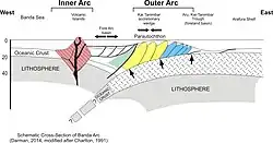 Plate tectonics theory which predict the presence of an accretionary wedge, composed of distal sediments scraped from the ocean floor at the inner side of the arc. At this place, however, de Smet (1999) found continental basement rocks and Early Mesozoic continental sediments. The situation is explained as the result of an inversion process of the Australian continental margin during the Neogene plate collision between Australia and the Banda subduction zone. De Smet (1999) concludes that the Outer Banda Arc is not an accretionary complex, but instead the compressed northern rim of the Australian continent. The load of Australian continental margin sediments that accumulated during the Mesozoic and Tertiary is pushed up on the back of crustal blocks of continental basement to form the present islands and mountains of the Outer Banda Arc. However, no evidence for involvement of Australian basement is found. All the ages of metamorphic rocks in Timor is pre-Jurassic (Banda Terrane) or Miocene-Pliocene).