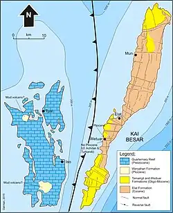 There are limited publication related to the geology of Kai Kecil (Small Kai). Pertamina-BEICIP map (1982) shows that Kai Kecil island complex is dominated by Quaternary reefs. Pliocene Weryahan Fm occur in isolated places as olistostrome, which probably generated by mud volcanoes. The Kai Kecil is separated from Kai Besar by a significant thrust fault dipping to the west.