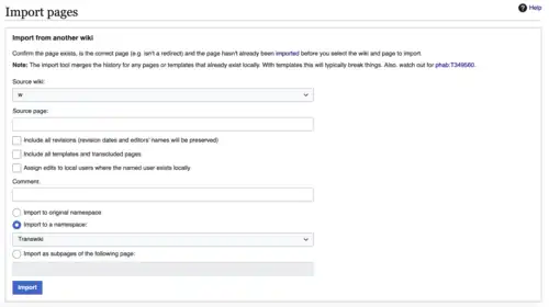You can import pages from certain WMF wikis (English Wikipedia, English Wikisource, English Wikiquote, English Wikiversity, English Wiktionary, English Wikinews, Meta-Wiki, Simple English Wikibooks, Wikispecies, Multilingual Wikisource, and Wikimedia Commons) directly to the English Wikibooks through a process known as transwiki import. If you are an administrator or import uploader, you can XML import, allowing you to import from any MediaWiki installation (not even just WMF projects), however, this guide does not cover that procedure.