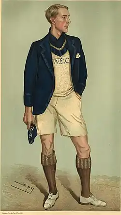 His chief peculiarities are a beautiful complexion, an almost girlish look, a very frequent blush (which is the outcome of much modesty), a temper that will bear much chaff, and a chin that in times of depression looks as though it would fall off and explode on the floor. Nevertheless, he is so generally liked that he gets their best work out of his men, and consequently he makes an excellent Dark Blue President. His rowing is so exceedingly graceful, easy, and effective, that he is probably one of the best No 7’s that ever sat in a boat; wherefore his uncle, Mr. J. C. Tinné -- that magnificent Dark Blue heavy-weight of the late sixties -- shows an amount of pride in the boy that is quite refreshing to witness. Beyond this he is a sportsman who can shoot high pheasants very well; while he has played football and taken a third class in Mathematical Moderations, and means to do something scientific in his Finals. He is a very well-built young fellow of much symmetry and proportion, except as to his arms; which are long. He is full of youth, and he delights in a bonfire. Nevertheless, he is a very good fellow, and a cheerful, staunch friend who displays much ignorance of our standard novelists.