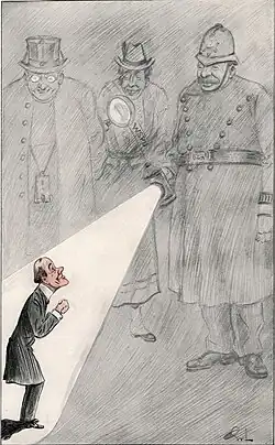 McKenna became President of the Board of Education in 1907 (shortly after his first appearance in Vanity Fair) and First Lord of the Admiralty in 1908, from which position as “a staunch disciple of Dilke’s naval policy”[6] he promoted the buildup of the British fleet, which proved prescient for the 1914-18 war. In 1911 he moved to Asquith’s Home Office where in 1913 he had to decide whether to force-feed imprisoned women suffragists or let them starve to death, a Hobson’s choice he attempted to resolve by seeking and obtaining passage of the “Prisoners (Temporary Discharge for Ill-Health) Act, 1913.” Generally known as the “Cat and Mouse Act,” the law gave McKenna discretion to “license out” prisoners who were close to starvation (so that any continuation of their hunger strike was on their own heads), but also to revoke parole promptly for any new offense. It pleased hardly anyody: neither the suffragists, for it did not give them the right to vote and weakened the political impact of their in-prison hunger strikes; nor did it please their opponents, who viewed early release on these grounds as an affront to law and order.[7] McKenna’s second appearance in Vanity Fair dates to that episode, in which the magazine, by then under Allinson’s uninspired hand and destined for absorption into Hearth and Home, came down vitriolically for the suffragists.