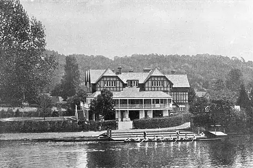 George Duncan Rowe (1857-1934) went head of the river at Oxford with University College in 1877 and 1878, and rowed in the Boat Race in 1879 and 1880. He was president of the O.U.B.C. the latter year, succeeding W.H. Grenfell. He co-captained Leander in 1883. As secretary (1887-97), he helped secure Temple Island for a Leander enclosure when the club was still based at Putney and orchestrated the construction of the Henley boathouse a decade later. It “is a great institution for that Club,” wrote Vanity Fair (July 22, 1897), “with a site on the bank close to the bridge, coffee and reading rooms, twenty bedrooms, ladies’ coffee-room, and a verandah balcony round two sides of the building. For luxury no modern rowing club house can come near it, and the architecture makes it a thing of beauty, and in full keeping with the weeping willow villa which it adjoins.” In 1900, he made the White House Meadow, where the Remenham Club and Regatta enclosure now stand, available as an enclosure for Leander members in lieu of Temple Island. Club president from 1919 to his death in 1934, Rowe would offer up his resignation at the annual dinner, to find it ignored and be “unanimously and uproariously reelected for another year.”[1]