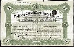 On 13 March 1888, Rhodes and Rudd launched De Beers Consolidated Mines after the amalgamation of a number of individual claims. With £200,000 of capital, the company, of which Rhodes was secretary, owned the largest interest in the mine (£200,000 in 1880 = £22.5m in 2020 = $28.5m USD).[17] Rhodes was named the chairman of De Beers at the company's founding in 1888. De Beers was established with funding from N.M. Rothschild & Sons in 1887.[note 1]